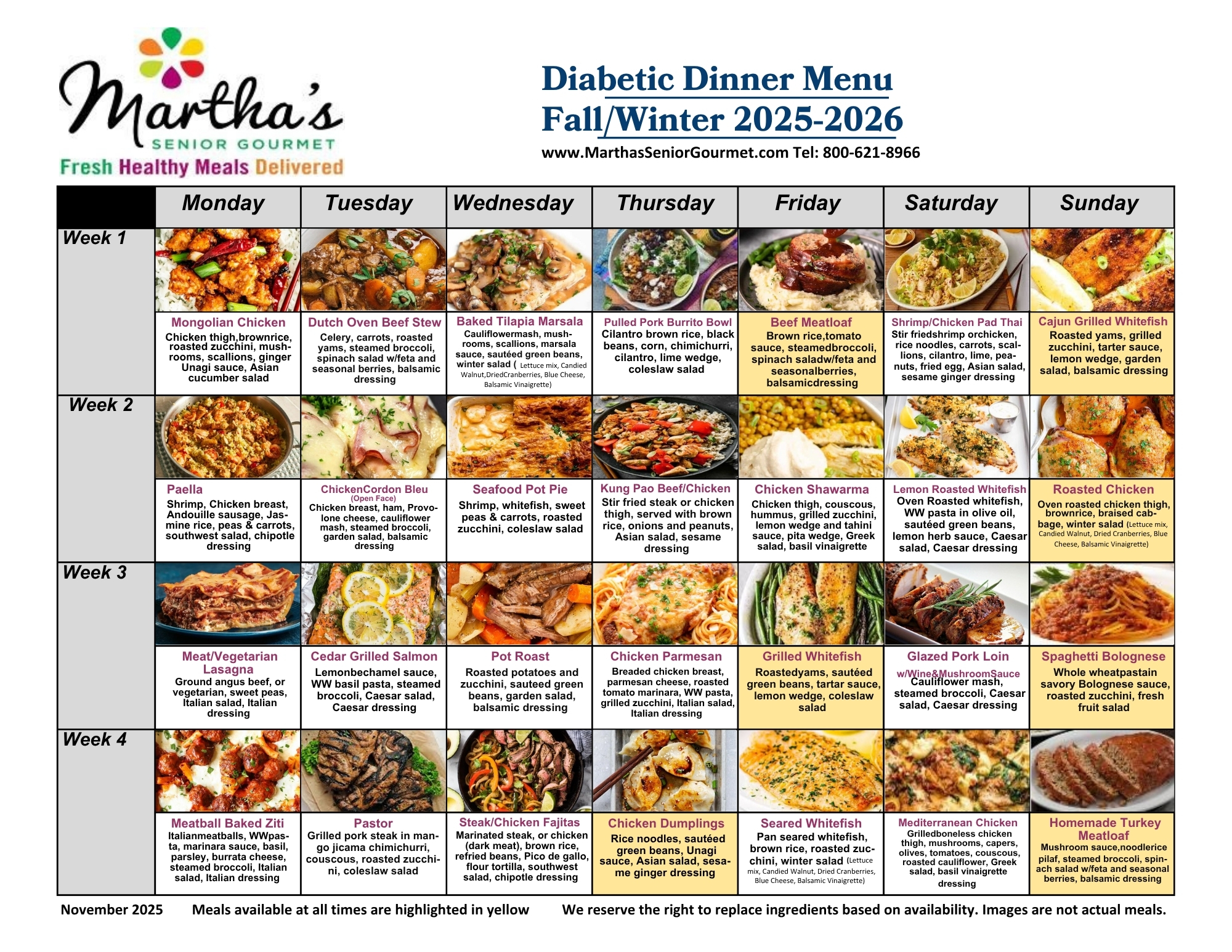 Making healthy food choices is made easy with the Martha’s Senior Gourmet diabetic menu and diabetic meal delivery. Our diabetic diet menu, overseen by a registered dietitian, is diverse and flavorful, keeping you interested in the food we serve. The diabetic meal plan includes lean protein, with fish at least once a week, whole grain, like couscous, brown rice and pasta and offers plenty of vegetables, both grilled and raw.