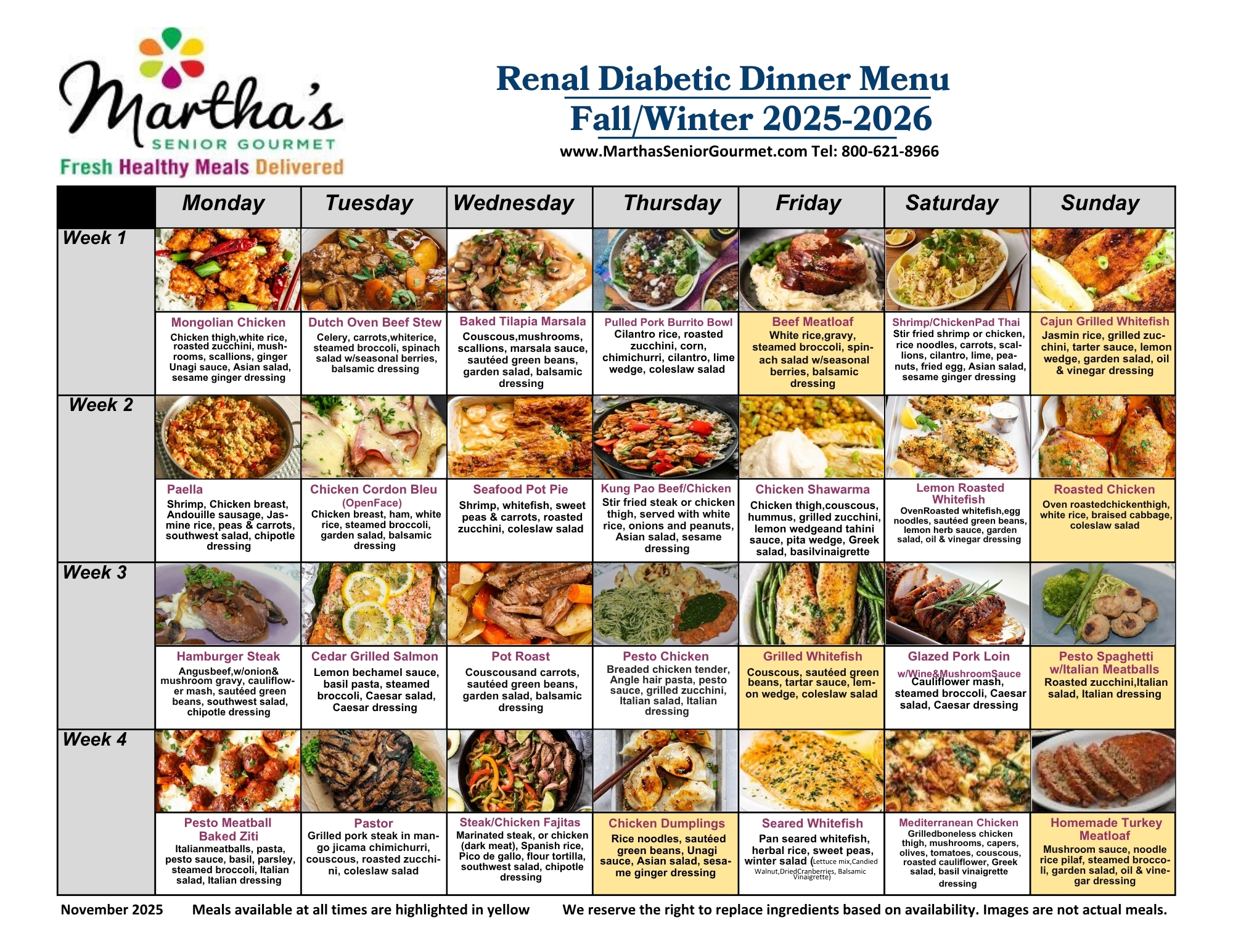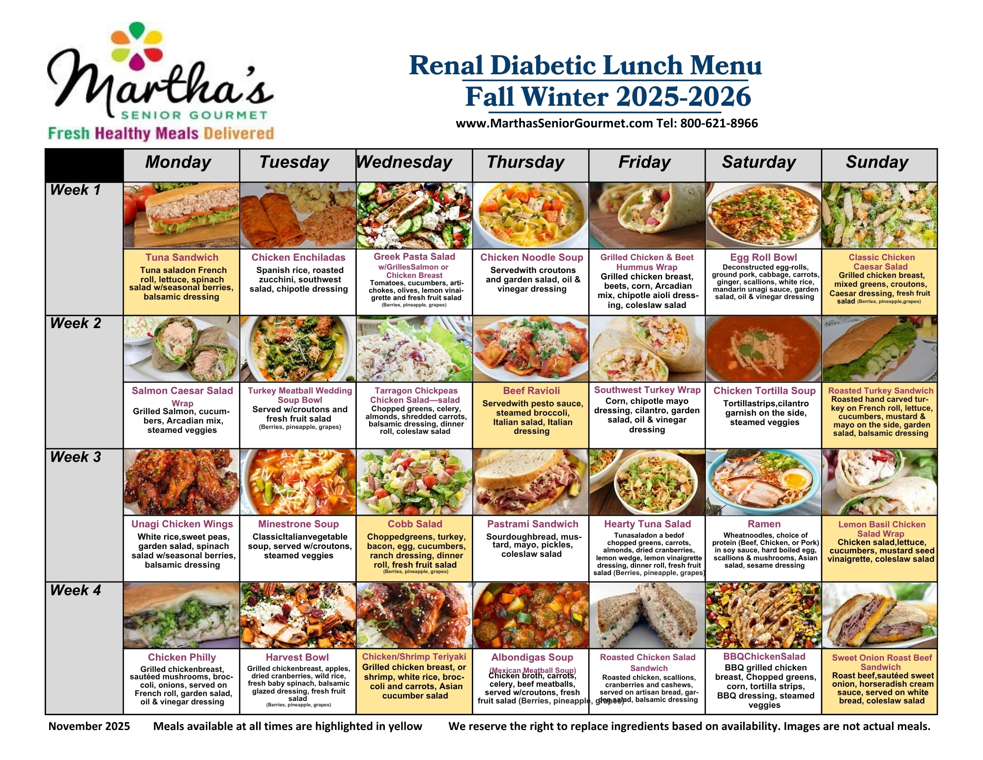 View our Renal-Diabetic lunch and dinner menus! Our healthy meal delivery service accommodates diets of all kinds and takes the guesswork out of cooking and preparing meals: it’s renal – diabetic meals delivered!