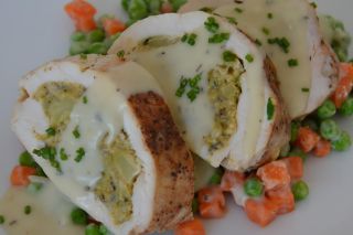 Chicken breast stuffed with spinach,, five grain medley, peas and carrots
