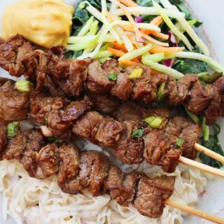 Steak with peas & mushrooms in savory peanut sauce over egg noodles
