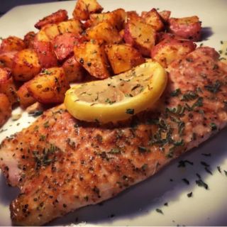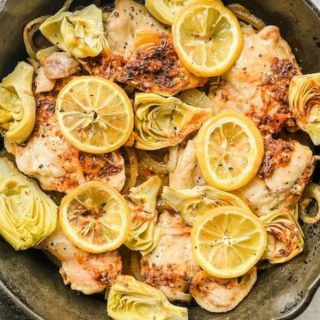 Grilled chicken breast, sautéed artichokes, lemon herb sauce, roasted potatoes, roasted cauliflower.
