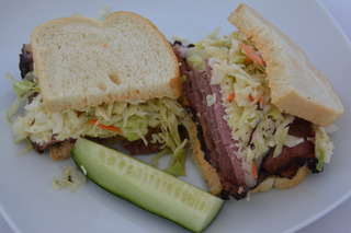 Pastrami, Sauerkraut, picke, Swiss cheese, thousand island dressing