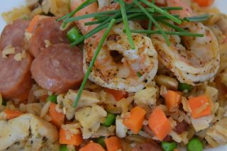 Shrimp, chicken breast, Andouille sausage, peas and carrots