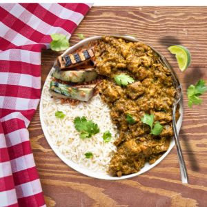 Chicken thigh, couscous, hummus, grilled zucchini, lemon wedge and tahini sauce
