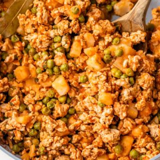 Ground turkey in BBQ sauce, petit corn, peas and carrots.