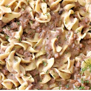 Ground beef and egg noodles in mushroom cream sauce, roasted zucchini.