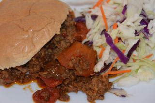 Ground beef, onions, tomatoes, Worcestershire sauce, wrapped in lettuce
